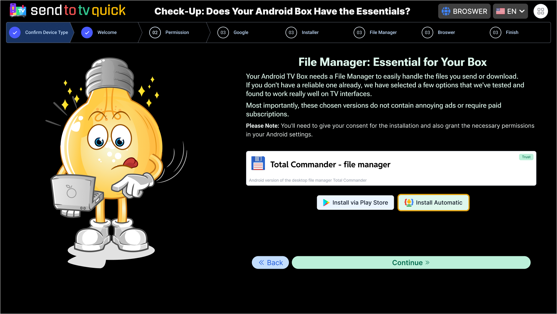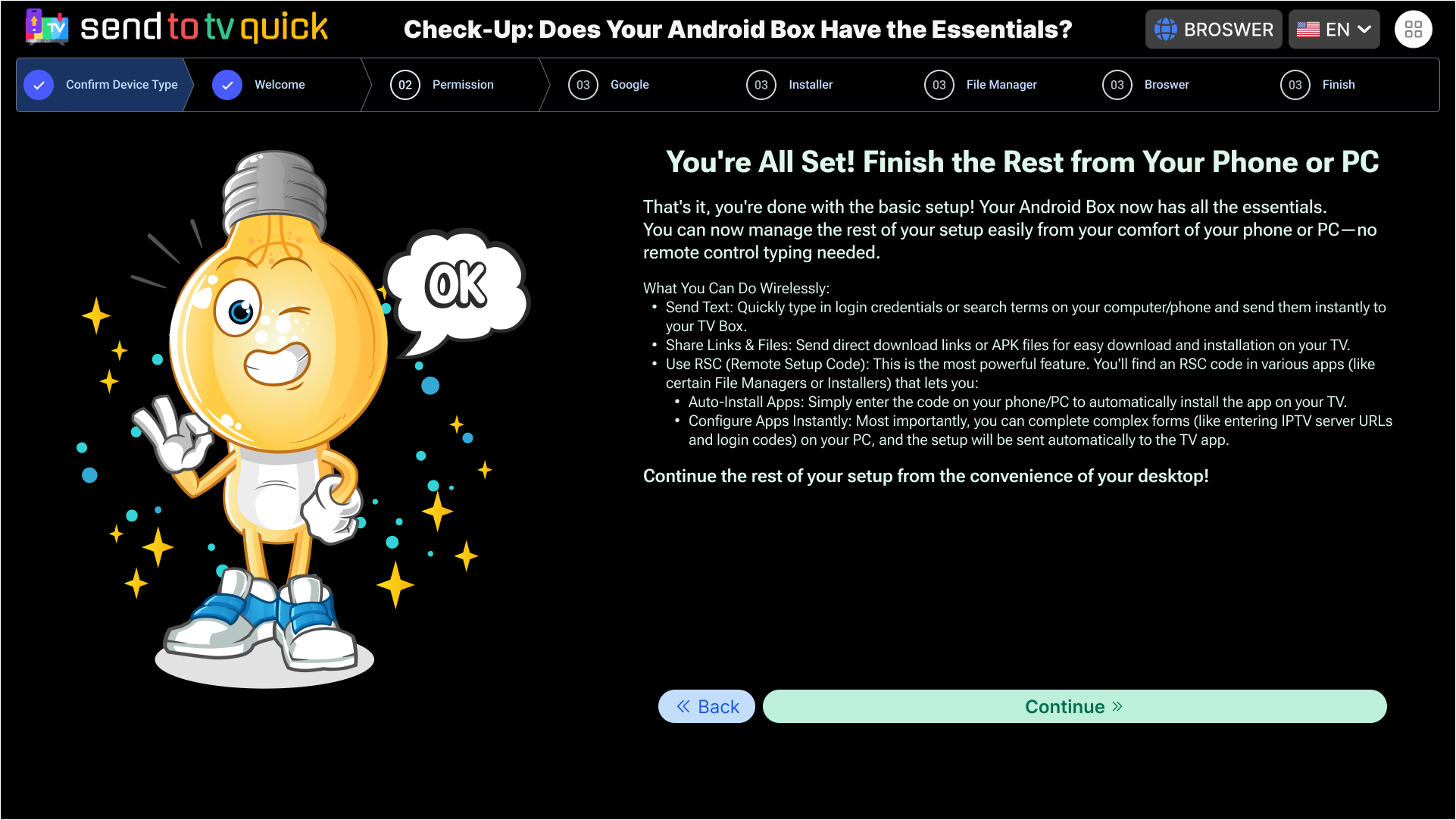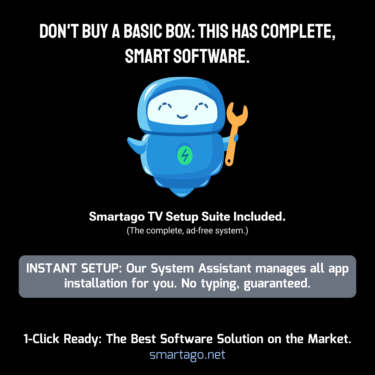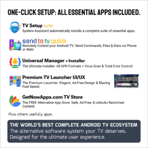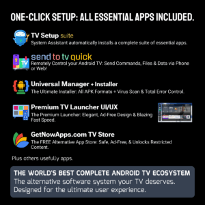 The included Remote Setup (STV) tool eliminates the clunky TV remote forever! Complete all complex configurations, login form filling, and setup tasks instantly from your phone or PC. Our System Assistant handles the automatic installation of your entire essential suite, ensuring non-stop performance, maximum speed, freedom, and personal privacy.